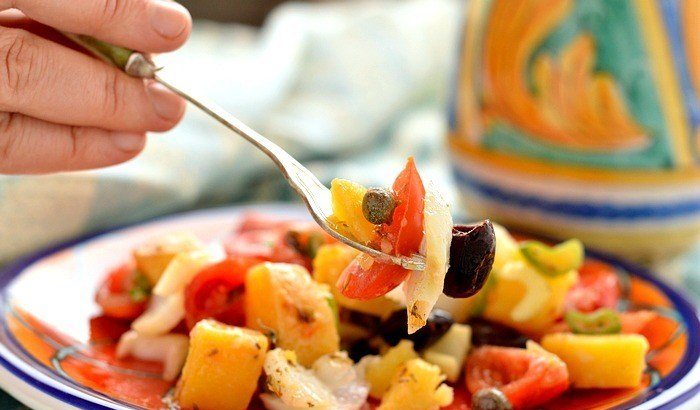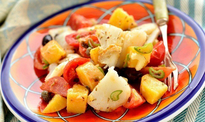 Ingredients: 1 kilogram of fish dip already soaked1 heart of black celery in brine, just350 grams of Pachino Igp2 tomatoes fresh Tropea onions PGI or two scalognis and pepper, as needed extra virgin olive oil, enough just oregano, just 400 grams of potatoes less than Pantelleria Igp in salt, just enough The preparation of the Sicilian stocco fish salad is very simple. Three days before you have to soak the fish in plenty of cold water (it will have to be completely covered) and you must remember to change the water every day. When the stockfish is softened, bring plenty of lightly salted water to the boil and boil the stockfish for 5 minutes. Drain the stockfish and allow it to cool. When the stockfish is cold, divide it into pieces and carefully remove any bits of bone or skin. I suggest you do this using your hands, so you can feel the presence of bones by touch. I advise you to boil the potatoes at least two hours before preparing the stocco fish salad, so that they are very cold: in this way they will be firm and you will be able to cut them with precision. If the potatoes are cut while they are still hot they will crumble. Wash the tomatoes and cut them in half. Remove the stone from the olives and cut them into slices. Peel the Tropea onion or the shallot and cut them into thin slices. Clean the heart of celery by removing any wires and cut it into slices. Desalt the capers in water for 15 minutes. Put the potatoes, tomatoes, pieces of stockfish, capers, olives, celery and onion slices in a large bowl or serving dish. Season the Sicilian stockfish salad with plenty of extra virgin olive oil, salt, freshly ground black pepper and oregano. Add, if you like a slightly acidic note, a little lemon juice. Mix the stocco fish salad gently, cover it with food contact film and keep it in the fridge for at least 2-3 hours so that the flavors blend together perfectly. Remember to bring the stockfish to room temperature before serving.