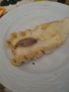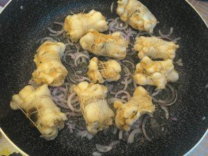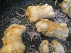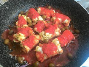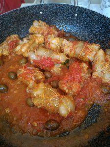 Ingredients: 10 stocco ventricelle (or trippette or trippicelle) 350 g fresh crumb50 g grated cheese50 gr grated Caciocavallo50 ml Olive oilq.b. Chopped parsley q.b. Salt500 ml Tomato sauce2 cloves Aglio1 Cipollaq.b. Kitchen twine The Ventricelle alla ghiotta are prepared using the "belly", belly of the stockfish. Take the ventricles and puliamole, removing some thorns (which could be present in the side) and depriving them of the skin and some black parts (what you can remove). Then wash them with cold water and put them in the fridge while you go to prepare the crumb for the filling. To the fresh crumb add the grated cheeses, the chopped garlic, the salt, the oil and the parsley, mix everything. With this mixture, fill the vines with a roll. Then, cut the onion into slices and put it in a pan with the oil and lay the ventricelle rolls on top, together with the tomato sauce, the green olives and a little parsley. Cook the Ventricelle alla ghiotta on a moderate flame for about 15 minutes.