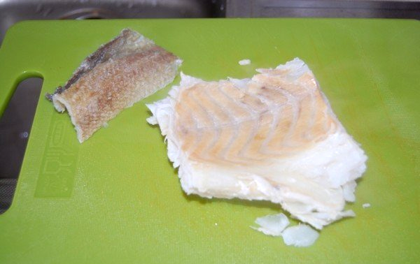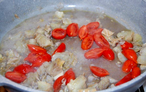 Tagliatelo a pezzetti. In una padella rosolate lo spicchio d’aglio ed aggiungete lo stocco a pezzetti.